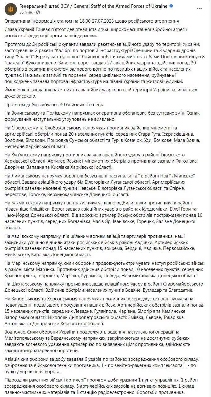 Генштаб ВСУ опубликовал оперативную информацию о российском вторжении по состоянию на 18:00 27 июля.
