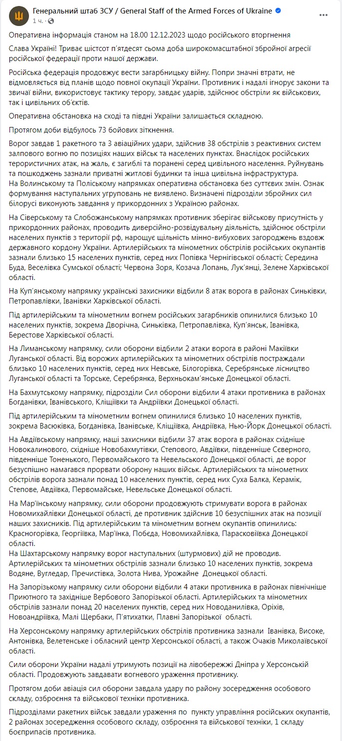 Во вторник, 12 декабря, в Украине идет 657-й день войны с Россией.