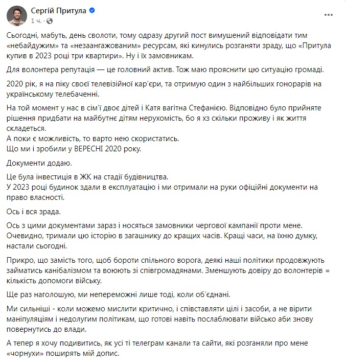 После публикации волонтер в Фейсбуке подтвердил, что его жена вступила в права собственности на три квартиры в Киеве. В то же время он заявил, что инвестиции в эти квартиры были сделаны ещё в сентябре 2020 года на этапе строительства комплекса.