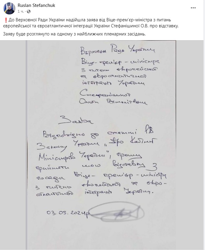 Также Стефанчук сообщил, что в Раду поступило заявление об отставке и от вице-премьер-министра – министра по вопросам реинтеграции временно оккупированных территорий Ирины Верещук.