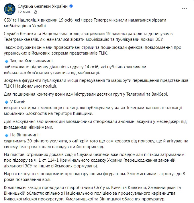 СБУ и Нацполиция разоблачили 19 администраторов и корреспондентов телеграм-каналов, которые "пытались сорвать мобилизацию и публиковали локации ВСУ, снимали провокационные стримы и распространяли фейковые сообщения об украинских военных, в том числе представителях ТЦК".