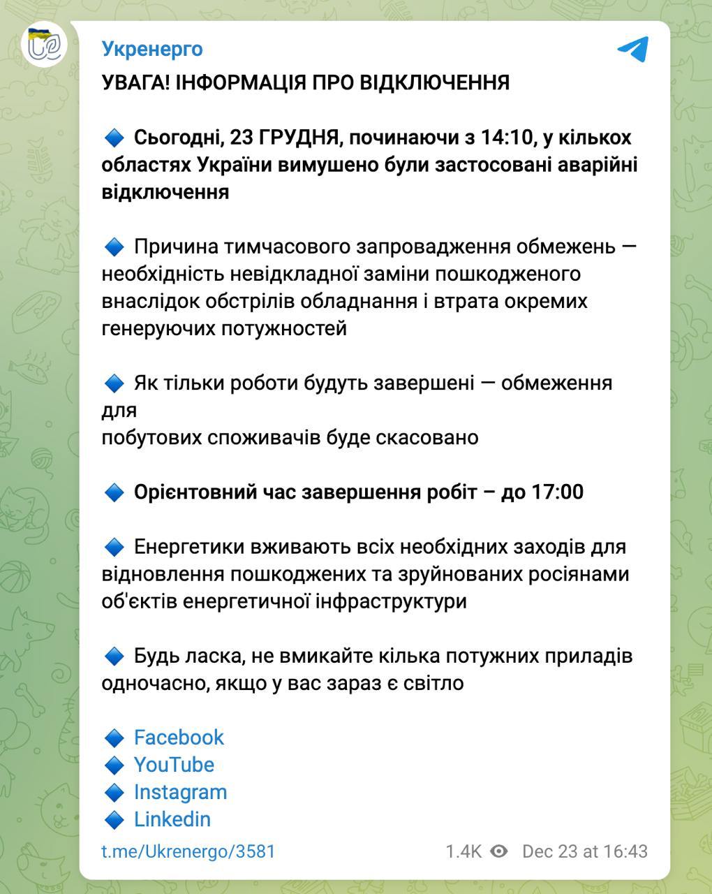 18:46 "Укрэнерго" отменило аварийные отключения во всех регионах.