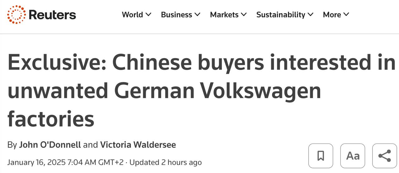 Покупка немецких автопроизводителей может стать "самой политически чувствительной инвестицией Китая на сегодняшний день", ведь VW долгое время был "символом промышленного могущества Германии, которому теперь угрожает глобальный экономический спад, ударивший по спросу, и скрипучий переход к зеленым технологиям".