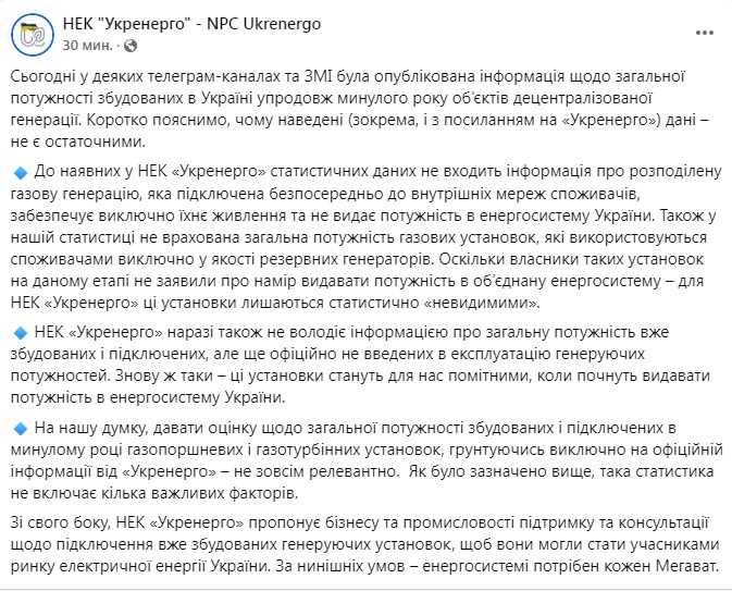 В компании отметили, что эти данные "не окончательные", поскольку не учитывают распределенную газовую генерацию, которая подключена к внутренним сетям потребителей и не выдает мощность в энергосистему Украины.