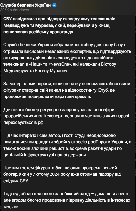 "По материалам дела, после начала полномасштабной войны фигурант создал свой канал на видеохостинге Ютуб, где продолжил распространять нарративы Кремля. Для этого блогер регулярно приглашал на свои эфиры пророссийских "политэкспертов", значительная часть из которых сейчас скрывается в РФ", - говорится в сообщении.