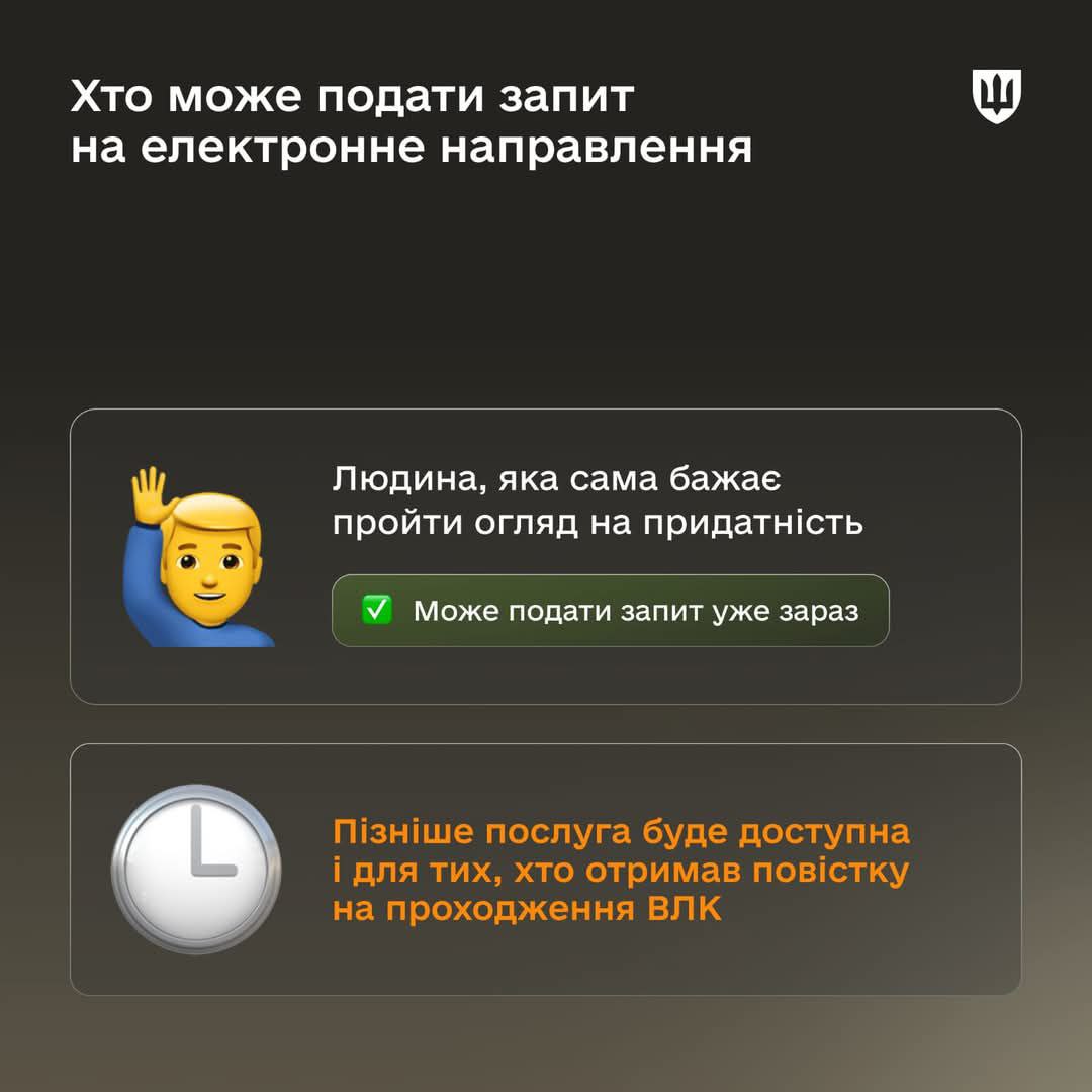 Как известно, ранее военнообязанные получали направление на ВВК исключительно в бумажном виде через ТЦК. Однако на днях Кабинет министров постановил, что военнообязанный может самостоятельно подать запрос и получить электронное направление на прохождение ВВК - без необходимости посещать ТЦК, чтобы взять такое направление.