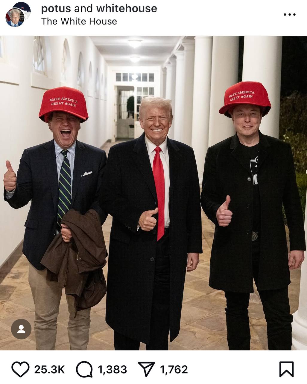 Вместе с Дональдом Трампом Маск и Карлсон попозировали в больших кепках с девизом республиканца "Make America Great Again" ("Вернём Америке былое величие").