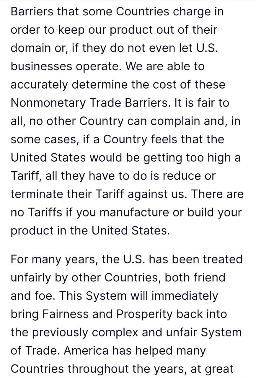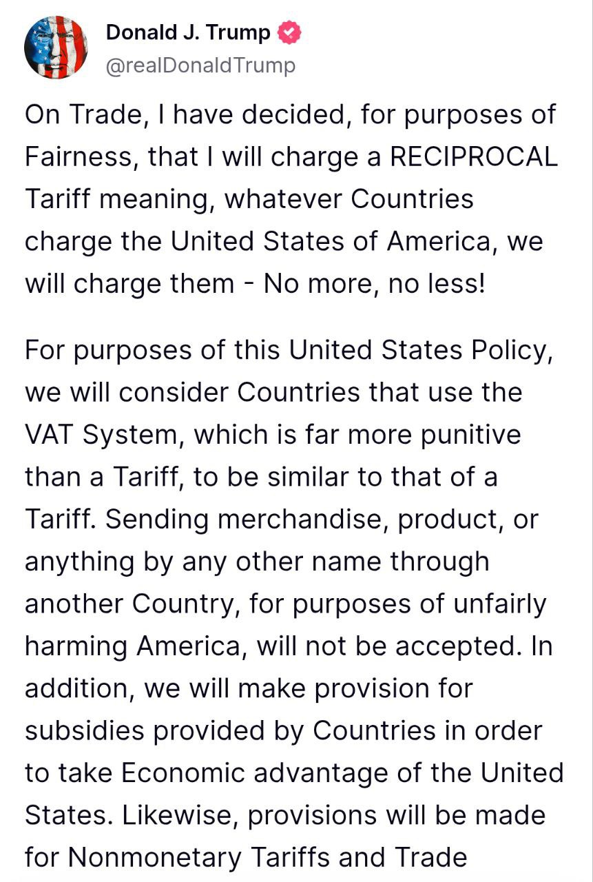 "Что касается торговли, то я решил, в целях справедливости, установить взаимный тариф, означающий, что какие бы страны ни взимали плату с Соединенных Штатов Америки, мы будем взимать ее с них – ни больше, ни меньше", – написал он.