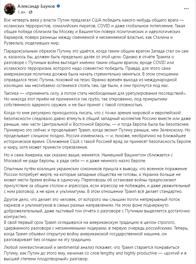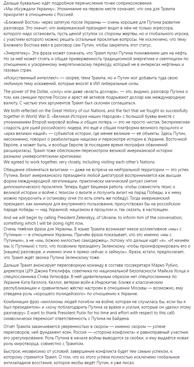 Затем Баунов разбирает другие фрагменты поста о звонке, свидетельствующие о желании, которое он приписывает Трампу: