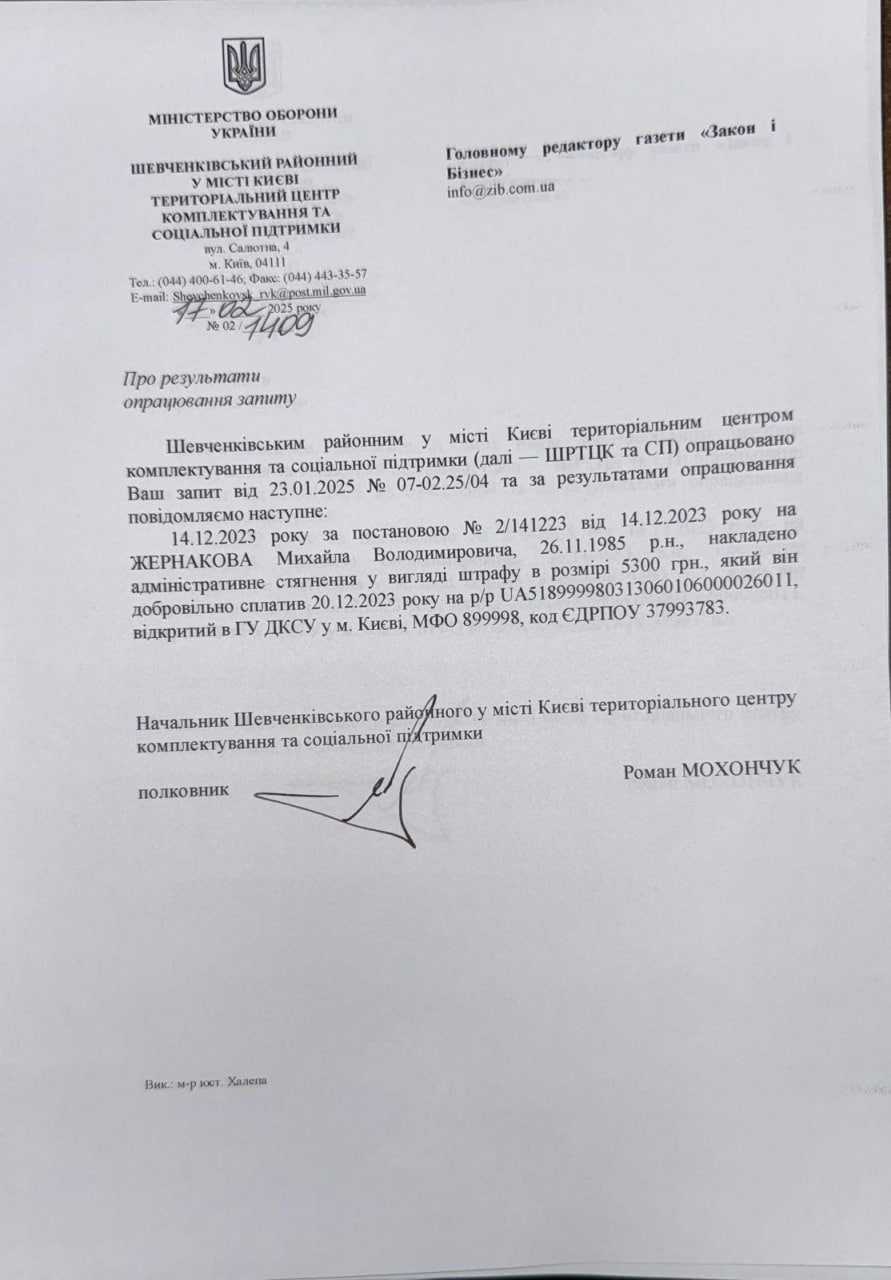 Напомним, что Жернаков разыскивался из-за неявки по повестке. В конце концов, он был задержан и доставлен в Шевченковский РТЦК Киева, где за уклонение от мобилизации был оштрафован на 5300 грн.