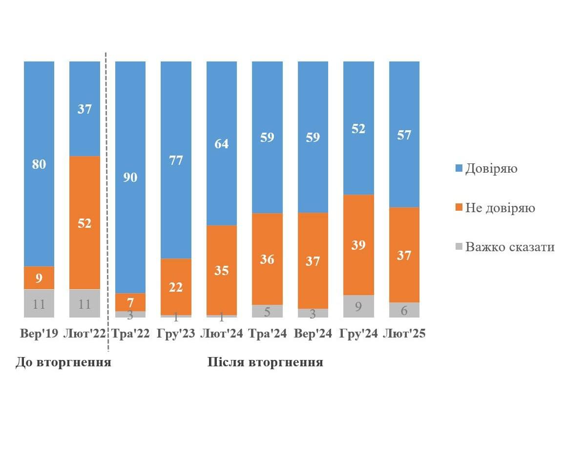 Отметим, что опрос КМИС, на который сослался Зеленский, вышел сегодня утром - через несколько часов после слов Трампа о низкой поддержке президента в Украине. Согласно его данным, за два последних месяца, с декабря 2024 по февраль 2025 года, рейтинг доверия украинцев Зеленскому вырос с 52% до 57%, хотя до этого он стабильно падал.