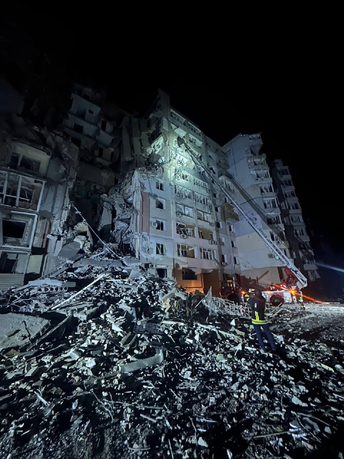 Сегодня ночью россияне ударили управляемой авиабомбой по жилому десятиэтажному дому. Разрушены пятнадцать квартир – с 1 по 10 этаж одного из подъездов. Пострадали шесть человек.