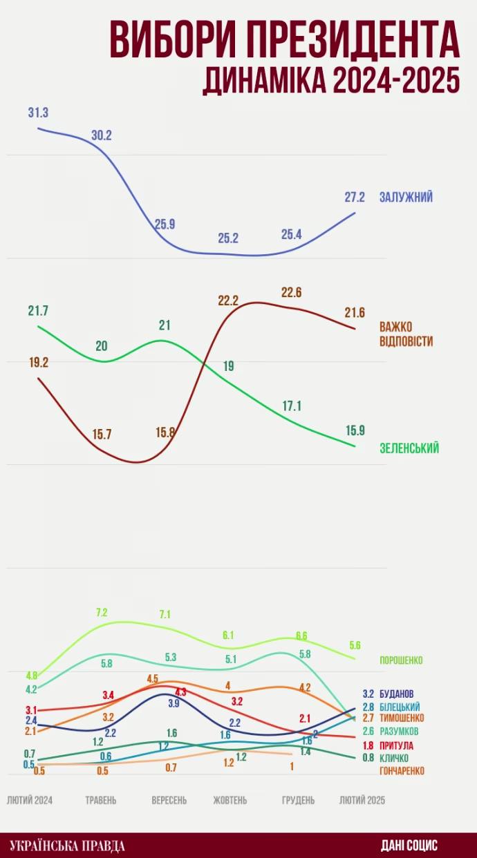 Первое место в рейтинге предвыборных симпатий занимает посол Украины в Великобритании Валерий Залужный. Его рейтинг тоже падал в начале 2024 года, когда его уволили с поста главнокомандующего ВСУ и он надолго исчез из информационного пространства, однако осенью начал расти и сейчас составляет 27,2%.