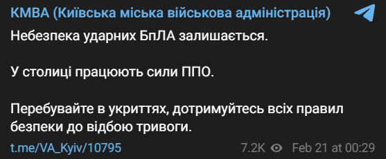 08:05 Сегодня ночью в Киеве работали силы и средства противовоздушной обороны из-за атаки российских ударных БПЛА.