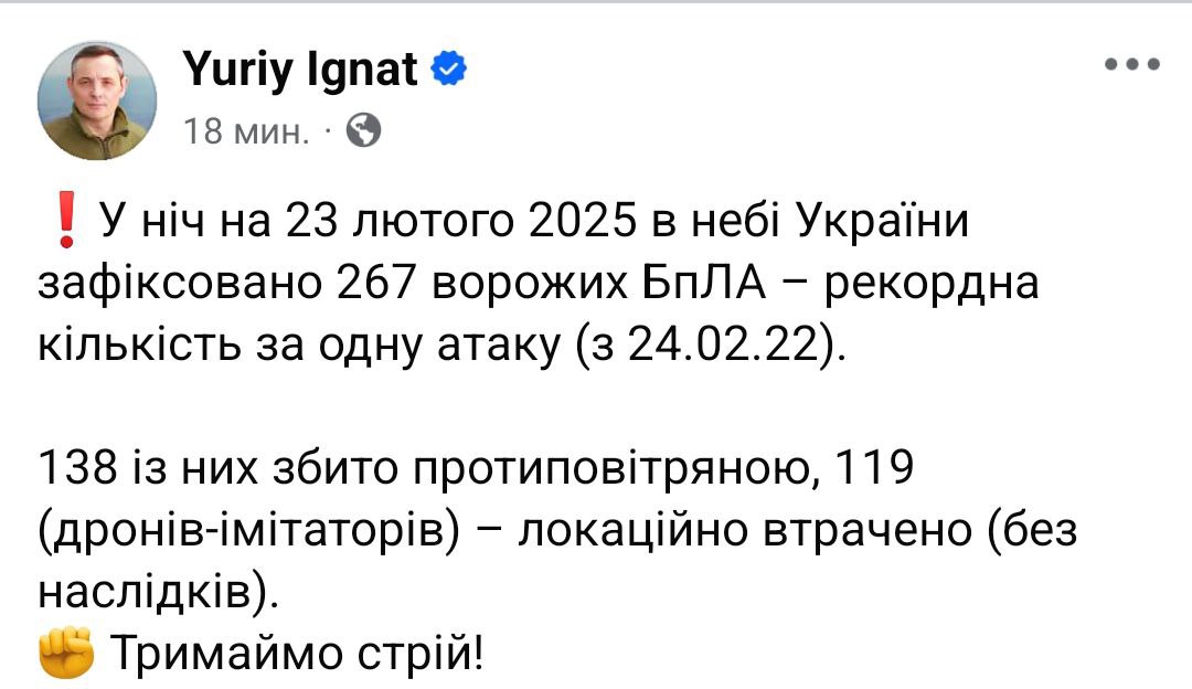08:28 Ночью Украину атаковали сразу 267 беспилотников разных типов. Некоторые военные паблики пишут, что это рекордное количество.