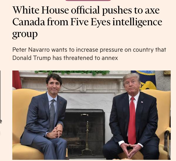Один из ближайших советников президента США Питер Наварро настаивает на том, чтобы США исключили Канаду из Five Eyes, куда также входят Великобритания, Австралия и Новая Зеландия.