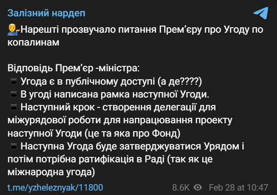 Между тем, премьер-министр Украины Денис Шмыгаль заявил в Верховной Раде, что соглашение о недрах, которое планируют подписать сегодня вечером, якобы уже открыто в публичном доступе.