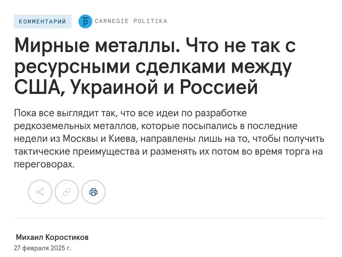 "Пока все выглядит так, что все идеи о разработке редкоземельных металлов, которые посыпались в последние недели из Москвы и Киева, направлены лишь на то, чтобы получить тактические преимущества и разменять их потом во время торга на переговорах. В рамках этой логики дело вполне может дойти до торжественного подписания меморандумов любого содержания. Но не приходится сомневаться, что вскоре они будут надежно забыты. Реальностью проекты разработки редкоземельных металлов смогут стать только тогда, когда российско-украинская война закончится устойчивым миром. И даже тогда это произойдет далеко не сразу", - делается вывод в статье.