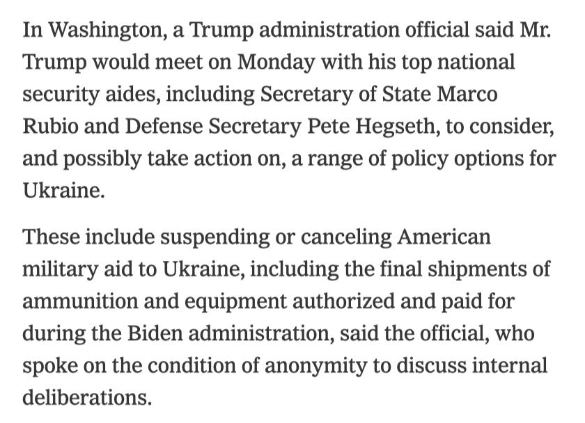 "Среди них - приостановка или отмена американской военной помощи Украине, включая последние поставки боеприпасов и оборудования, санкционированные и оплаченные в период администрации Байдена, сообщил чиновник на условиях анонимности", - пишет издание.