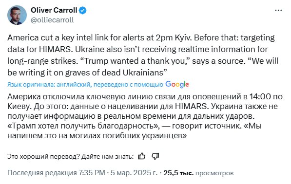 Соединенные Штаты отключили Украине системы оповещения (вероятно, о воздушных атаках), а также целеуказания для ракетных установок HIMARS.
