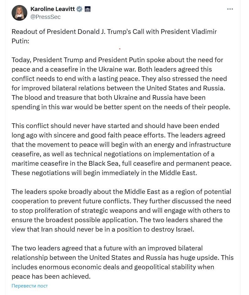 "Сегодня президент Трамп и президент Путин обсудили необходимость мира и прекращения огня в войне в Украине. Оба лидера согласились с тем, что этот конфликт должен закончиться прочным миром. Они также подчеркнули необходимость улучшения двусторонних отношений между США и Россией. Кровь и ресурсы, которые Украина и Россия тратят на эту войну, лучше направить на нужды их народов.