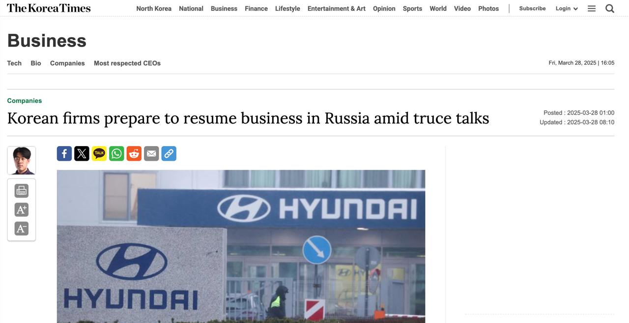 Южнокорейские компании рассматривают Россию как большой рынок, где любят их товары, стратегический хаб из Центральной Азии и Европу и "критически важный рынок для диверсификации деловых интересов, особенно на фоне растущего тарифного давления со стороны Соединенных Штатов".