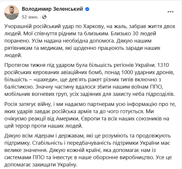 Он отметил, что в течение недели под ударом находилось большинство регионов Украины. Россияне выпустили 1310 управляемых авиационных бомб, более 1000 ударных дронов, большинство – "Шахеды", еще девять ракет разных типов, включая баллистику.