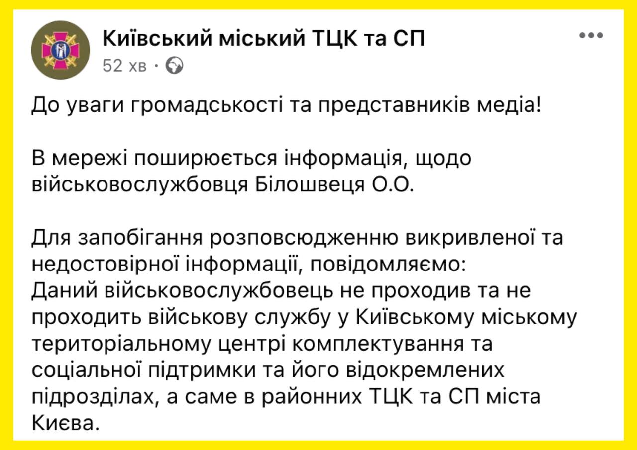 Однако Белошвец все-таки работал в Киевском ТЦК, но не в городском, а областном.