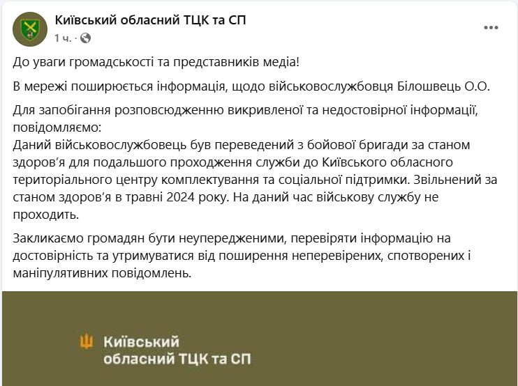 В Киевском областном ТЦК заявили, что он был переведен из боевой бригады по состоянию здоровья для дальнейшего прохождения службы в Киевский областной ТЦК.
