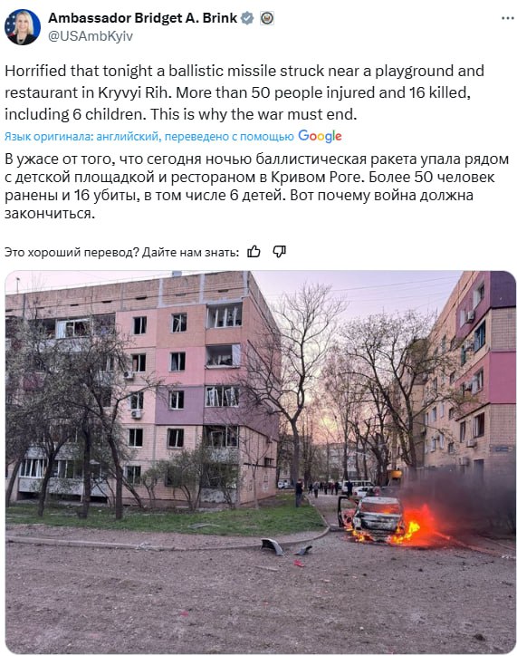 22:53 Посол США в Украине Бриджет Бринк прокомментировала ракетный удар по Кривому Рогу, не упомянув Россию, но призвав к завершению войны.