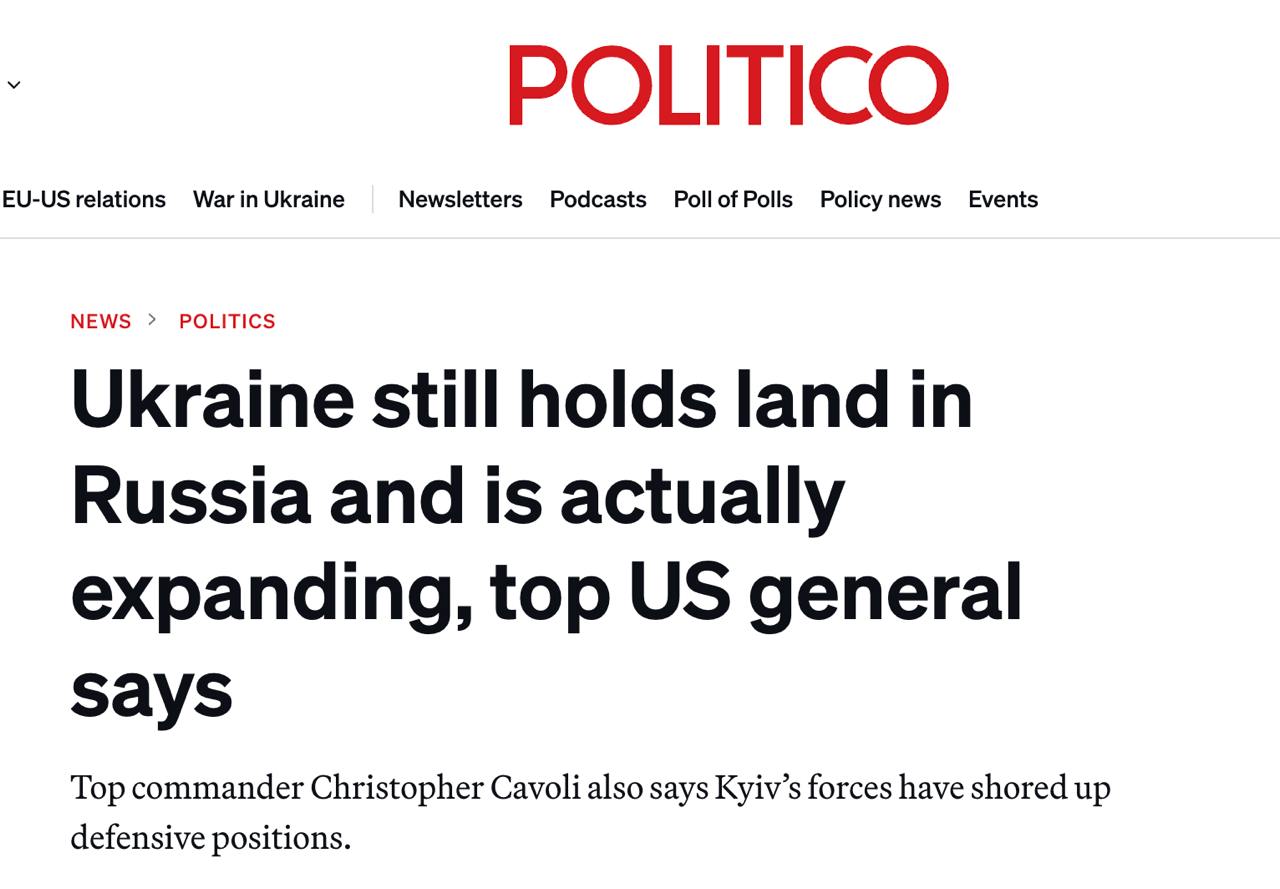 "В Курской области России сейчас находятся значительные силы, удерживающие значительный - уменьшившийся, но значительный - участок территории (по данным карты DeepState, сейчас в Курской области ВСУ контролируют 63 квадратных метра в сравнении с 480 в начале года - Ред.). И они удерживают очень хорошую оборонительную позицию к югу оттуда в Белгородской области", - сказал Каволи, которого цитирует Politico.