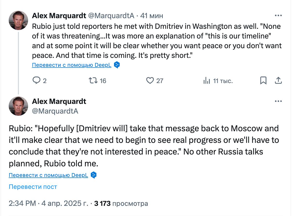"Ничего из этого не было угрожающим... Это было скорее объяснение того, что "таков наш график" и в какой-то момент станет ясно, хотите вы мира или не хотите. И это время наступает. Оно довольно короткое. Надеюсь, (Дмитриев - Ред.) передаст это сообщение в Москву и даст понять, что мы должны начать видеть реальный прогресс, иначе нам придется сделать вывод, что они (Кремль - Ред.) не заинтересованы в мире. Рубио также сказал, что других переговоров с РФ пока не планируется", - написал Марквардт.