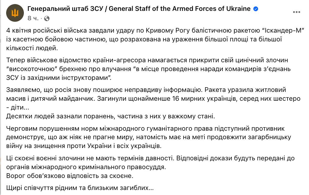 Генеральный штаб Вооруженных сил Украины отрицает, что вчерашний удар по Кривому Рогу наносился по совещанию украинских и западных военных.