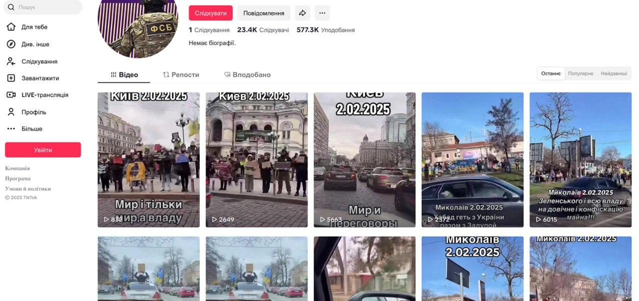 Публикуются скриншоты видеопубликаций . Один из роликов озаглавлен: "Зеленского и всю власть на пожизненное с конфискацией имущества". В названия других видео фигурируют призывы к миру и переговорам.