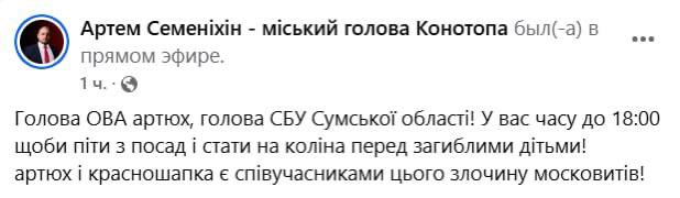 Также мэр Конотопа Артем Семинихин призвал главу Сумской ОВА Владимира Артюха и главу областного СБУ немедленно уйти в отставку после ракетного удара по Сумам.
