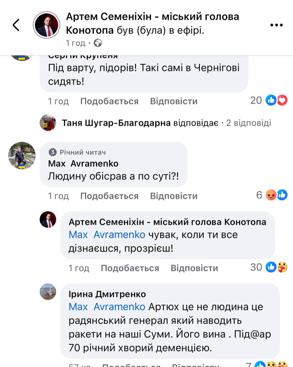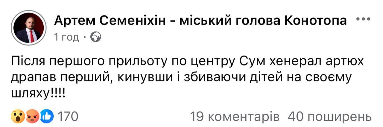 В комментариях Семинихин пишет, что люди "прозреют", когда узнают, что произошло. А один из комментаторов написал, что "Артюх это советский генерал, который наводит ракеты на наши Сумы. Его вина".
