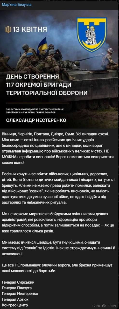 О том, что планировалось праздничное награждение бойцов 117 бригады, дает понять и нардеп Безуглая, которая разместила фото о годовщине создания бригады в своем телеграм-канале. Также она дала понять, что утечку информации могло допустить руководство ОВА, рассылая в открытой форме приглашения на мероприятие.