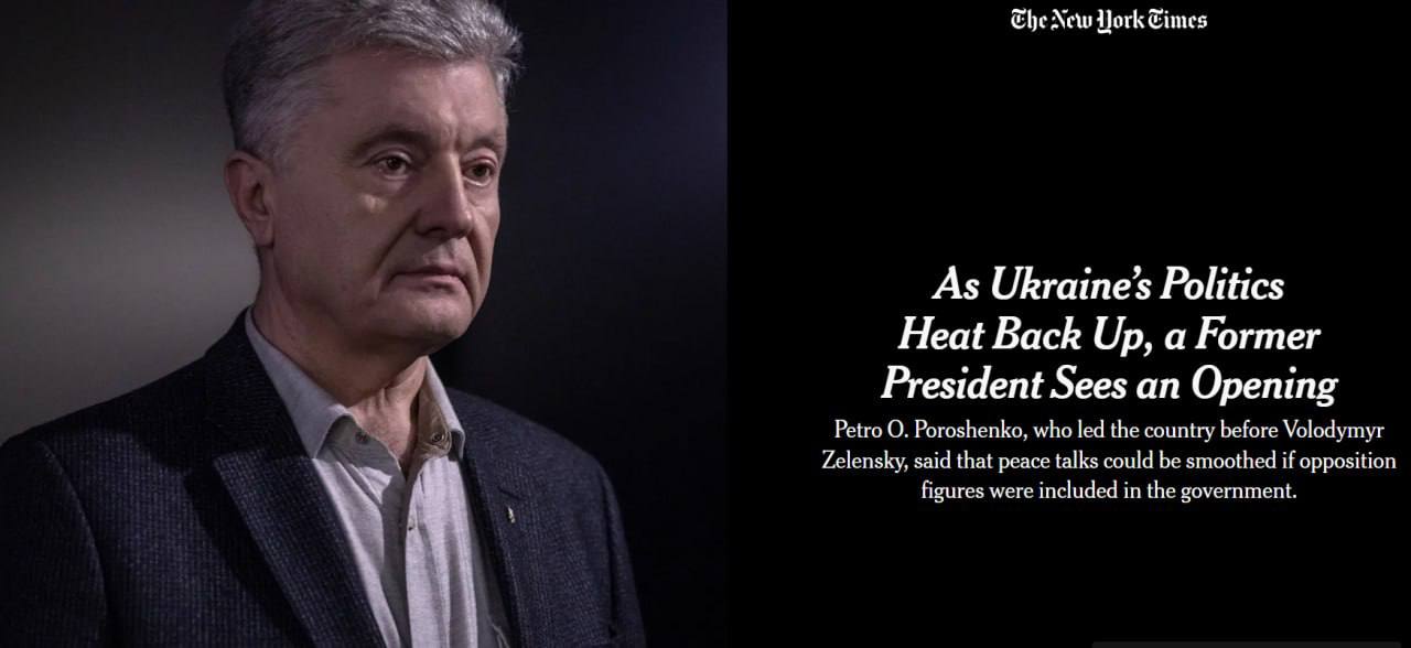 Американская газета The New York Times посвятила статью бывшему президенту Украины Петру Порошенко, который в интервью изданию заявил, что мирные переговоры с РФ могут пройти более гладко, если в правительство войдут представители оппозиции.