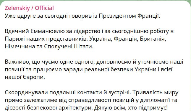 "Благодарен Эмманюэлю за лидерство и за сегодняшнюю работу в Париже наших представителей - Украина, Франция, Великобритания, Германия и Соединенные Штаты", - написал он.