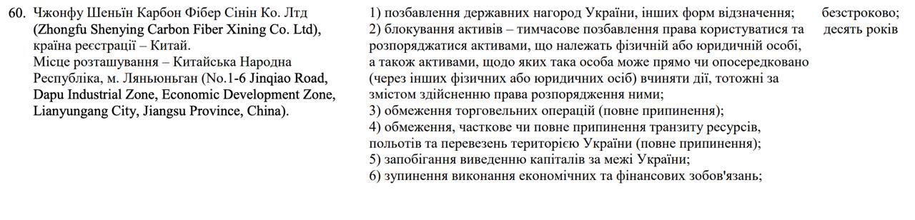 Президент Владимир Зеленский ввел санкции в отношении трех китайских компаний: Beijing Aviation And Aerospace Xianghui Technology, Rui Jin Machinery и Zhongfu Shenying Carbon Fiber Xining.