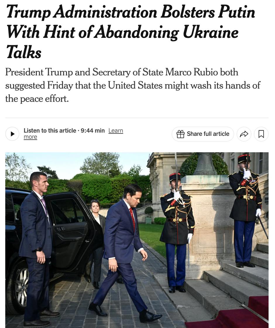 "После пятничных комментариев Трампа и Рубио фундаментальный вопрос заключается в том, планируют ли Соединенные Штаты оставить оборону Украины полностью украинцам и Европе, в то время как Трамп переходит на другую сторону и стремится к сближению с Россией", - заключает издание.