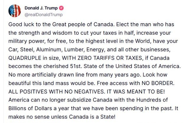 Трамп написал в своей соцсети Truth, что "граница между странами искусственная". Он "пожелал успеха" канадцам в выборе "личности, у которой будет сила и мудрость снизить налоги вдвое, бесплатно увеличить военную мощь до самого высокого уровня в мире, в четыре раза увеличить компании с нулевыми тарифами или налогами", и добавил, что для этого Канаде нужно стать 51-м штатом США.