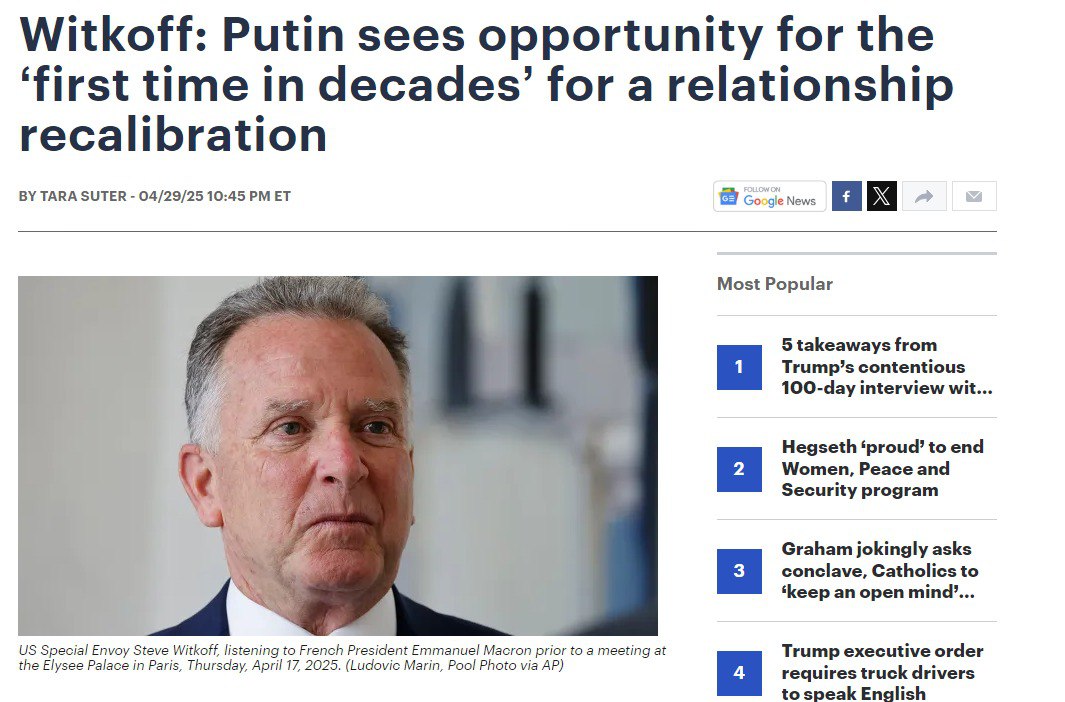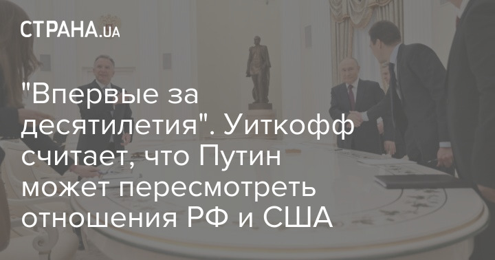 Спецпосланник президента США Дональда Трампа Стивен Уиткофф считает, что лидер РФ Владимир Путин видит возможность "впервые за десятилетия" пересмотреть отношения Москвы и Вашингтона.