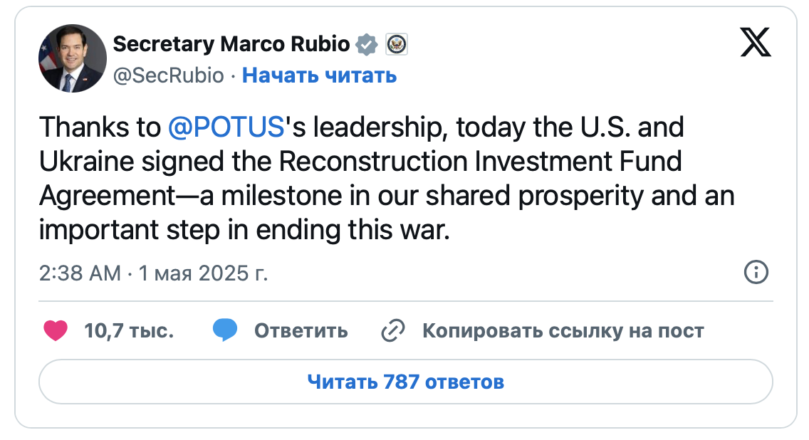 "Благодаря лидерству президента Трампа США и Украина подписали соглашение об Инвестиционном фонде реконструкции - важную веху на пути к нашему общему процветанию и важный шаг к прекращению этой войны", - заявил Рубио.