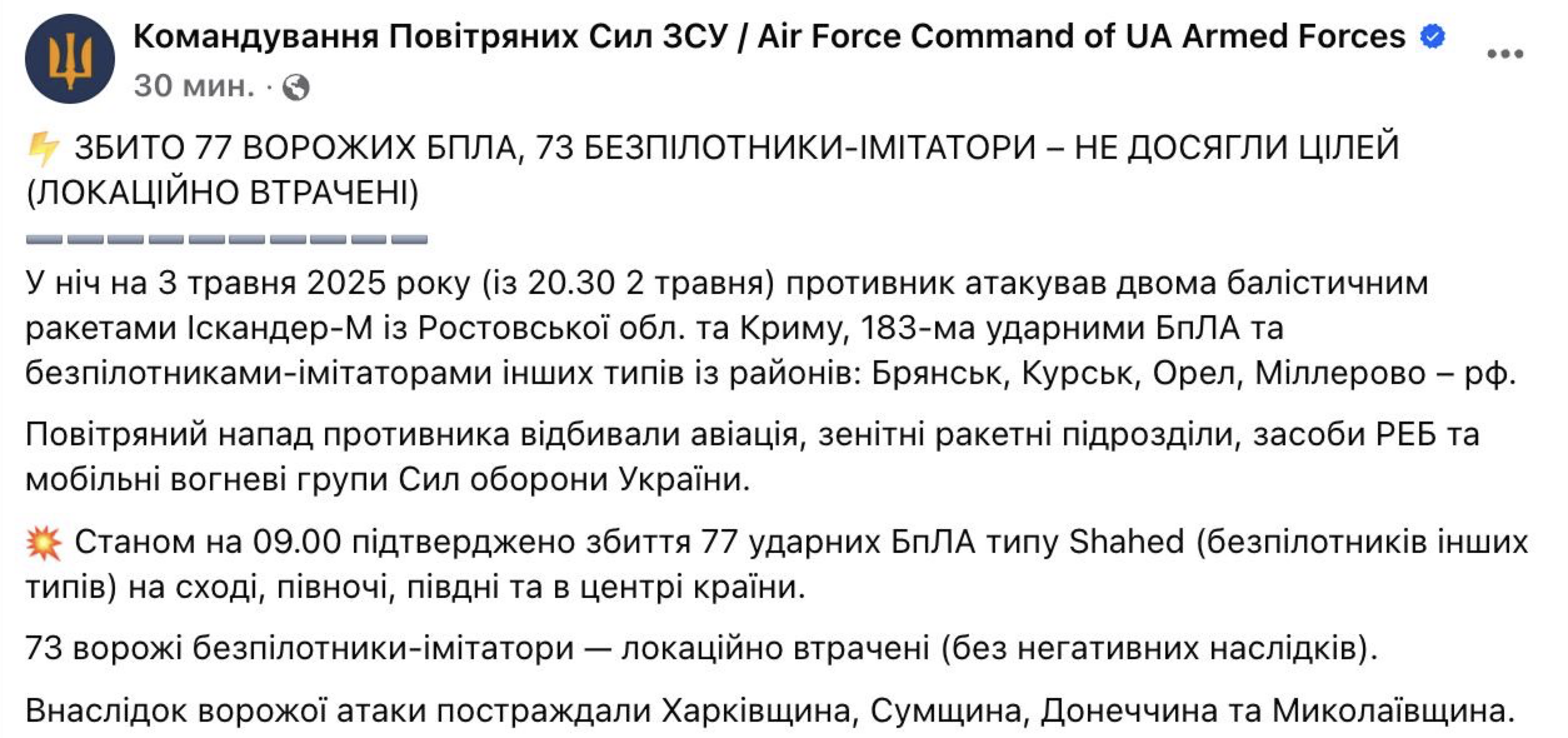 09:33 Россия ночью ударила по Украине двумя ракетами «Искандер» и 183 беспилотниками, сообщают ВСУ.