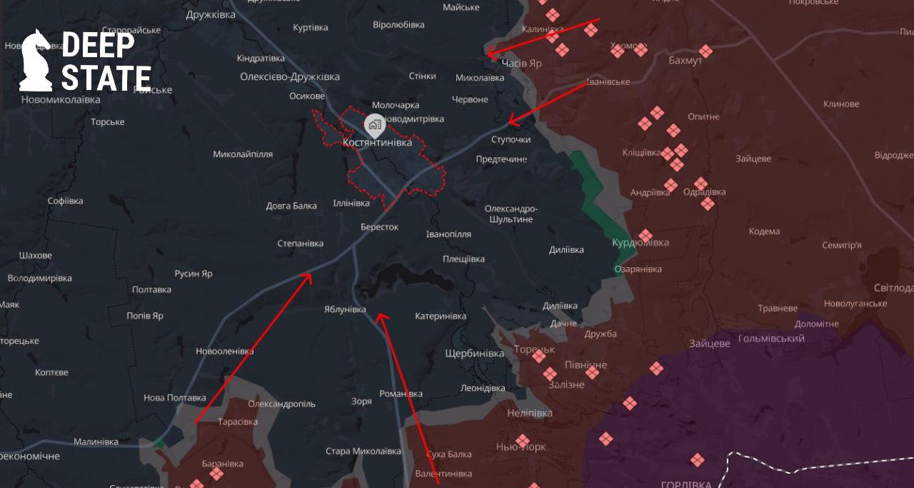 21:43 Россияне усиливают давление на окрестности Константиновки, пишет украинский военный паблик Deep State.