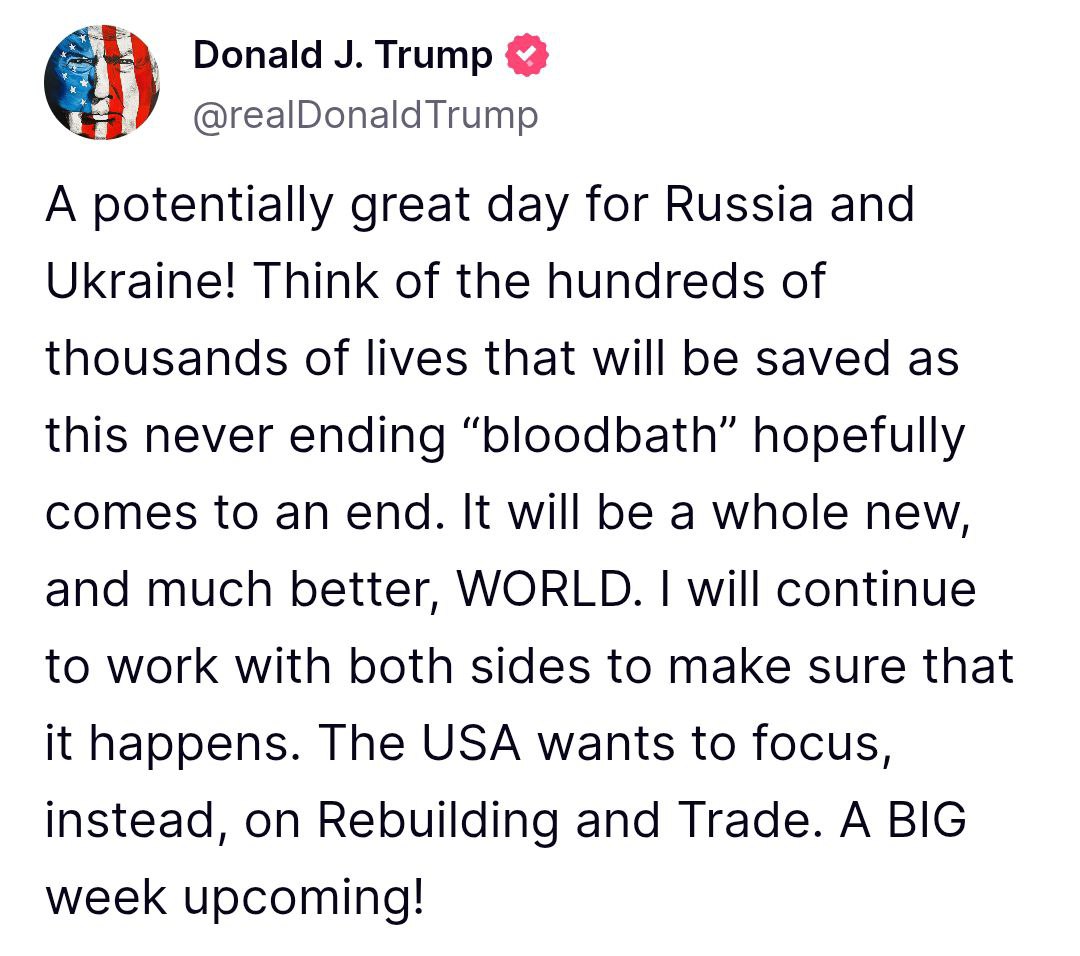"Потенциально отличный день для России и Украины! Подумайте о сотнях тысяч жизней, которые будут спасены, так как эта бесконечная "кровавая баня", надеюсь, закончится. Это будет совершенно новый и гораздо лучший мир. Я продолжу работать с обеими сторонами, чтобы убедиться, что это произойдет. Вместо этого США хотят сосредоточиться на восстановлении и торговле. Предстоит великая неделя!", - написал Трамп.