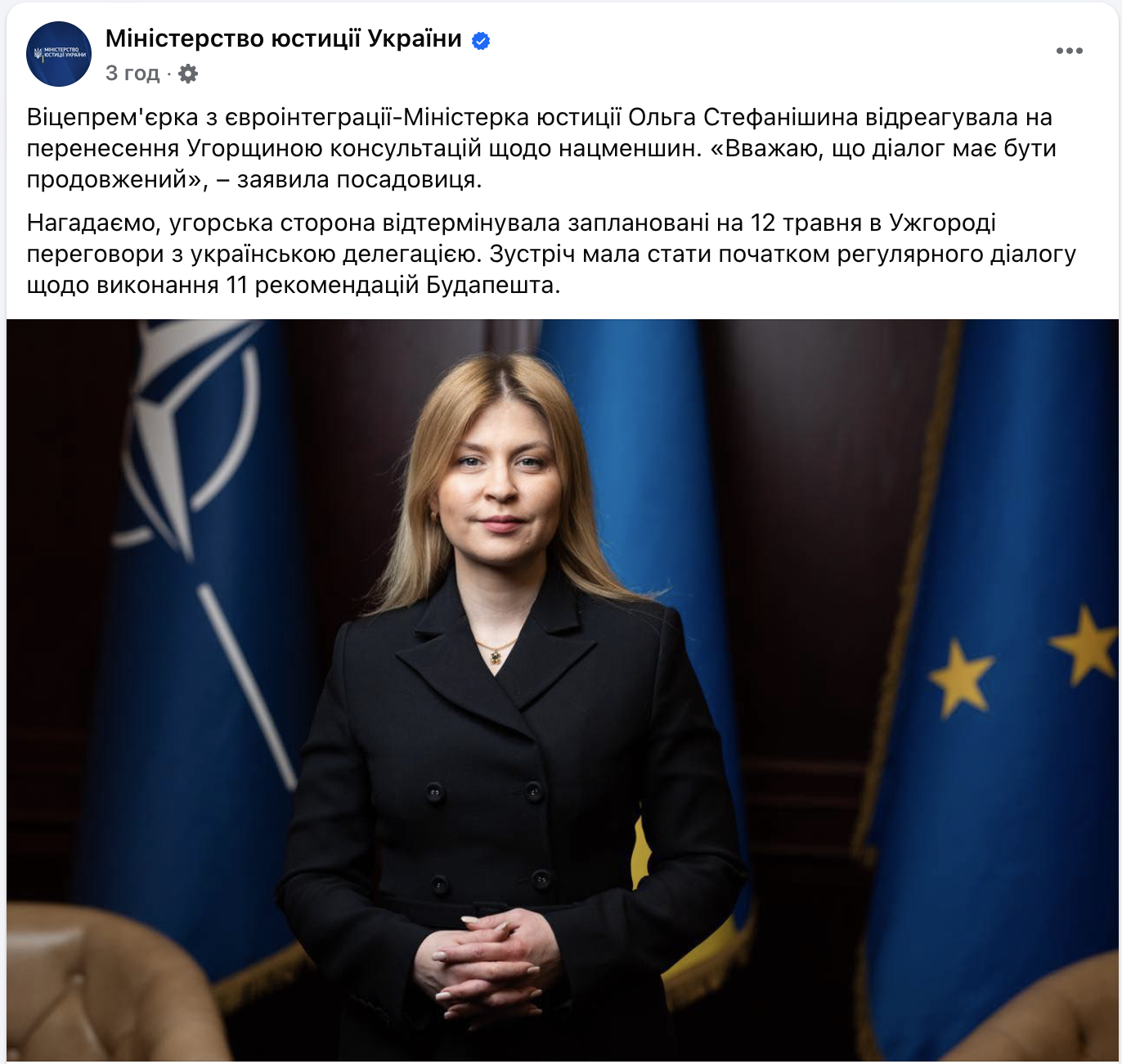 Вице-премьер по евроинтеграции-министр юстиции Ольга Стефанишина отреагировала на перенос Венгрией консультаций по нацменьшинствам.