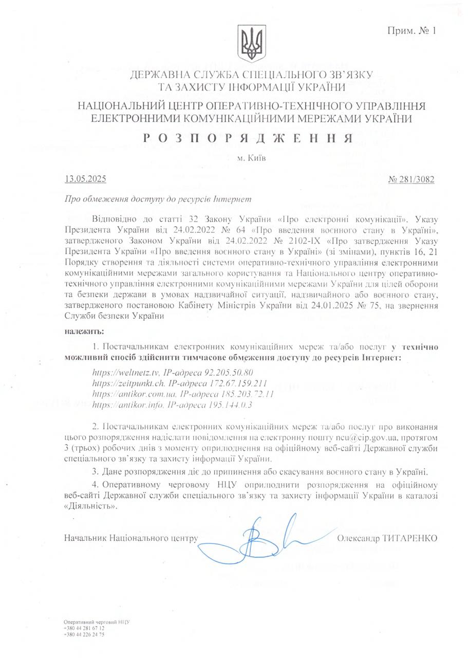 В распоряжении сказано, что провайдеры обязаны отчитаться о его выполнении в течение трех дней с момента обнародования документа на сайте госслужбы. Причем распоряжение действует до конца военного положения.