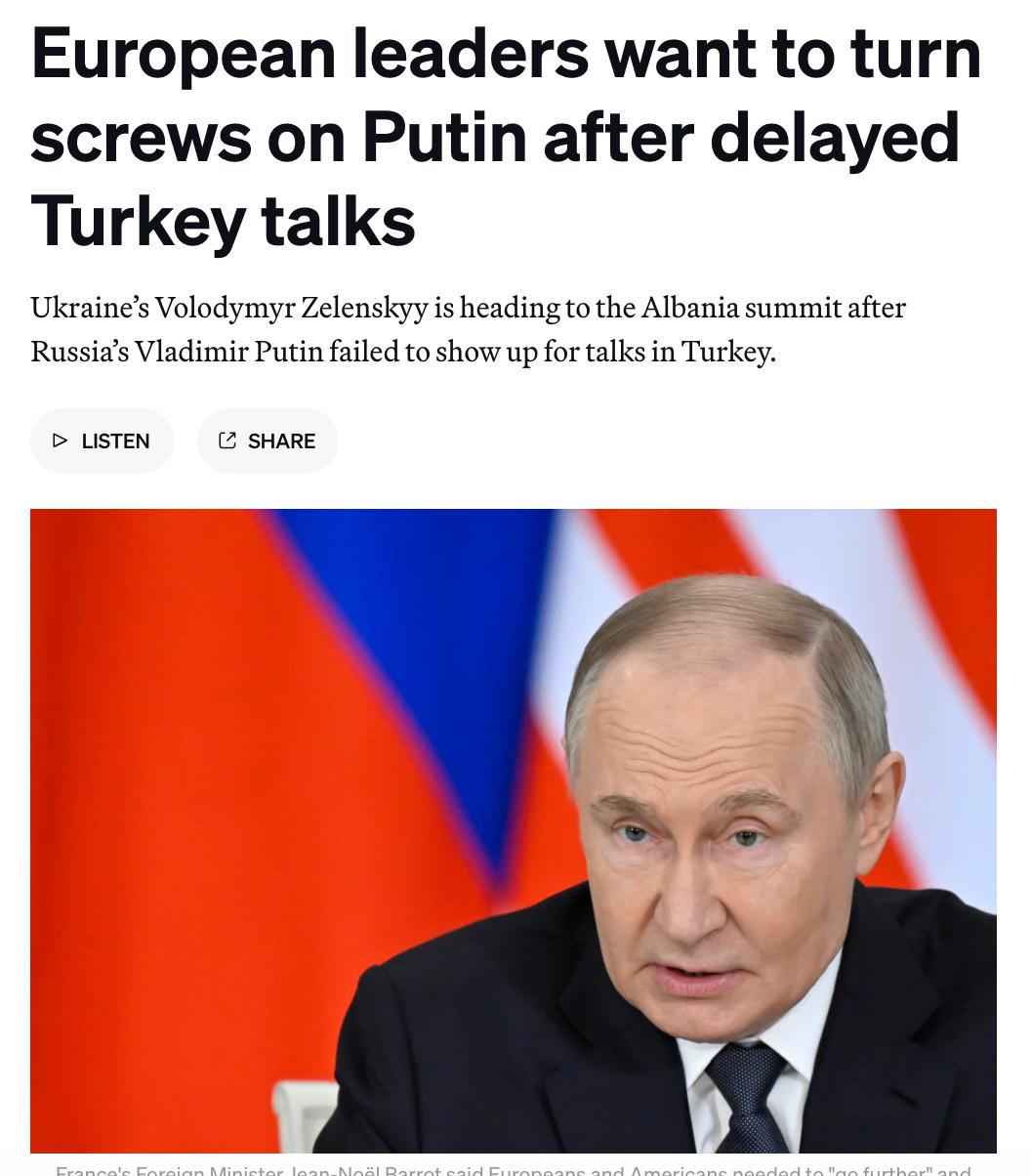 Европейские лидеры готовятся ввести дополнительные санкции против Владимира Путина после его неявки на переговоры в Турции между Киевом и Москвой.
